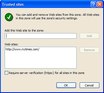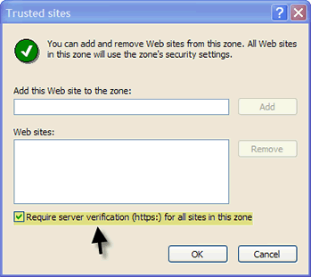 3.   Then click on the button "Sites". A window will open, where you can add any sites that you wish to be in the Trusted zone. Be sure to remove the check by the entry "Require server verification (https:)...."